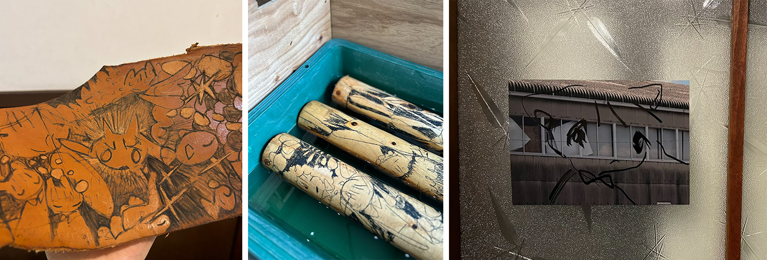 げこる公開制作期間中、お客様がお持ちになった物に、げこるが即興ドローイングをいたします。