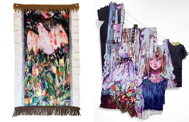 画像左「音へ向かえ」74cm×47.5cm 布にアクリル絵具